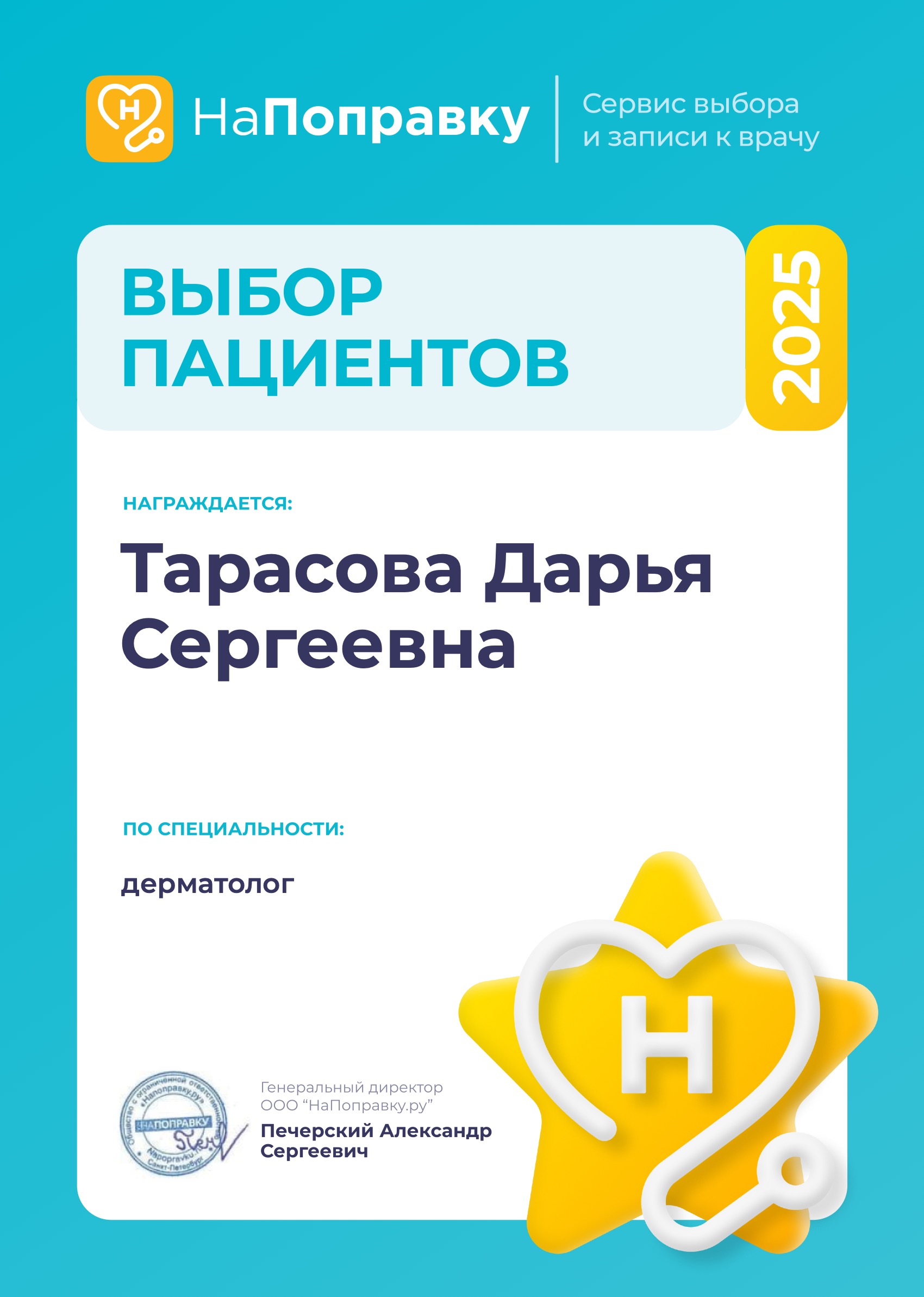Сведения из сертификата специалиста, специальность и дата подтверждения: сертификат "Дерматовенерология", годен до 31.10.2025 г., выдан: ФГБОУ ВО СЗГМУ им. И. И. Мечникова.