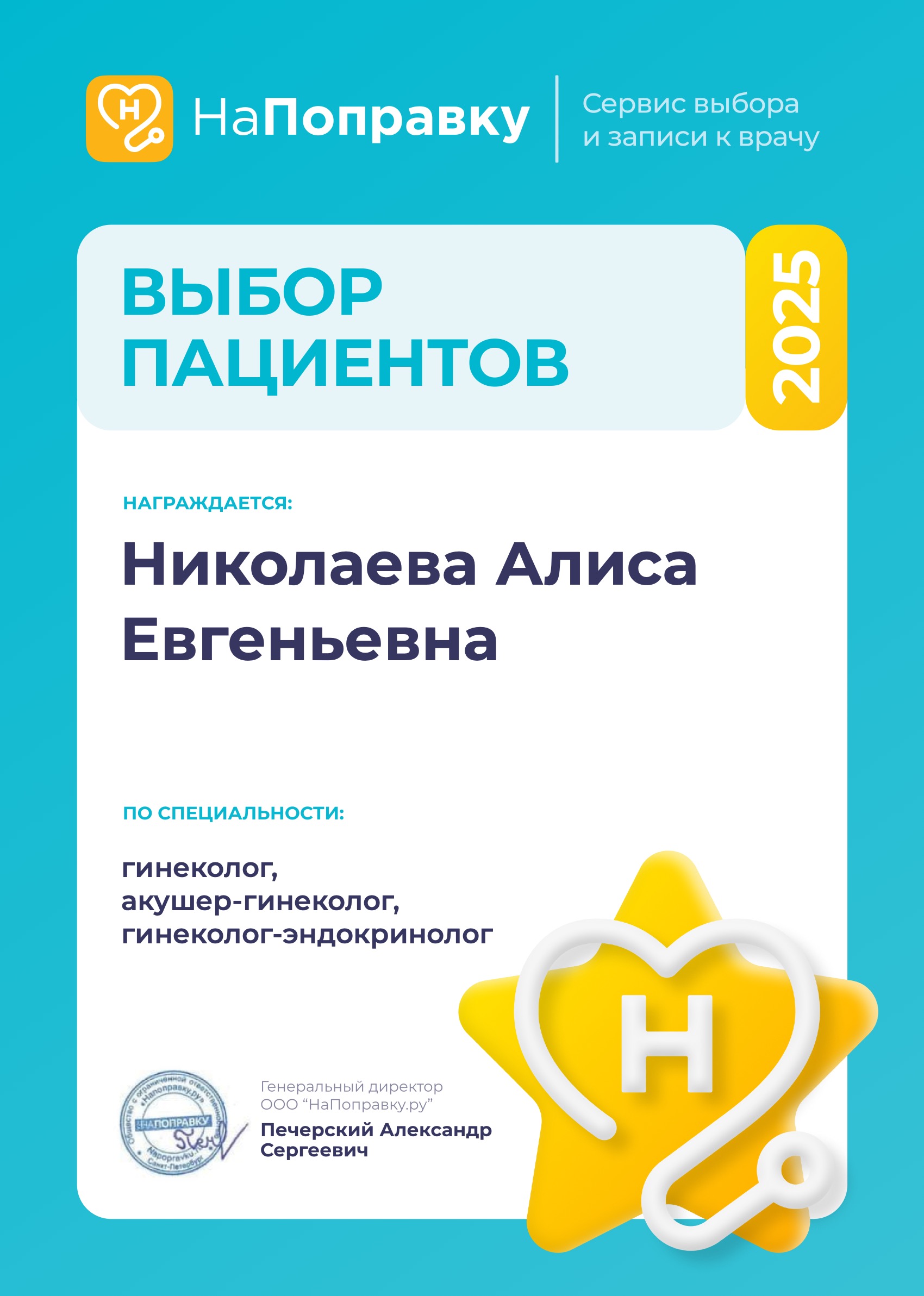 Сведения из сертификата специалиста, специальность и дата подтверждения: сертификат "Акушерство и гинекология", аккредитация годна до 25.06.2029 г., выдана: ФГБОУ ДПО РМАНПО Минздрава России; сертификат "Ультразвуковая диагностика", аккредитация годна до 25.06.2029 г., выдана: ФГБОУ ДПО РМАНПО Минздрава России.