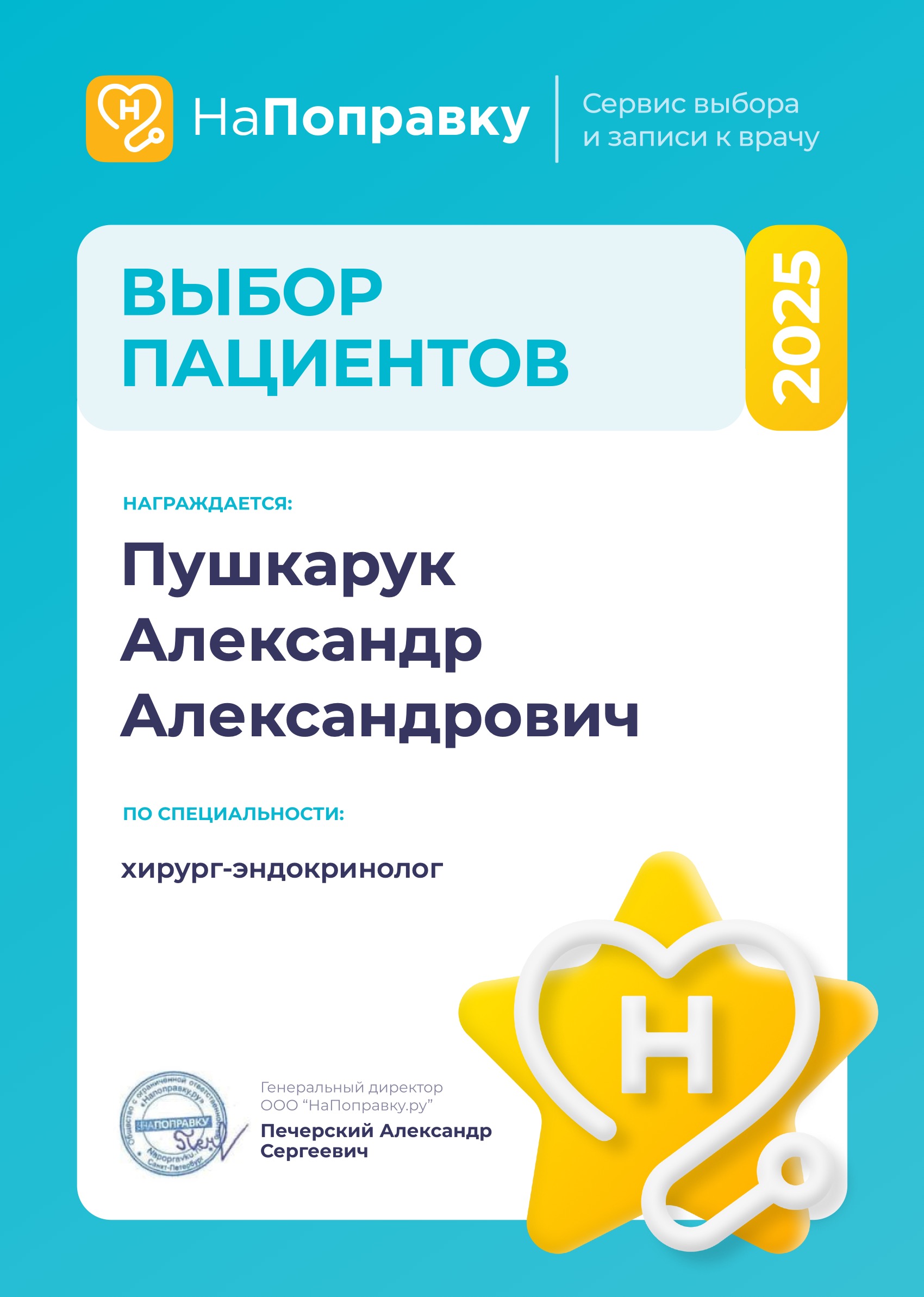 Н.И. Пирогова на операцию по удалению щитовидной железы. Самое волнительное для пациента это ожидание операции. После общения с доктором Пушкарук Александром Александровичем, который непосредственно готовил меня к операции, поднимается дух и настроение. Есть еще врачи которые лечат не только руками , но и словом! Профессионал своего дела он ответил на все волнующие меня вопросы, вселил оптимизм и уверенность. Операция прошла успешно, большое спасибо замечательному хирургу д.м.н. И.В. Слепцову. Но и после операции Александр Александрович был рядом, провел УЗИ, рассказал об итогах операции, назначил дозу лекарства, дал рекомендации по дальнейшим действиям и опять вселил оптимизм и уверенность. Желаю от души Вам, Александр Александрович,