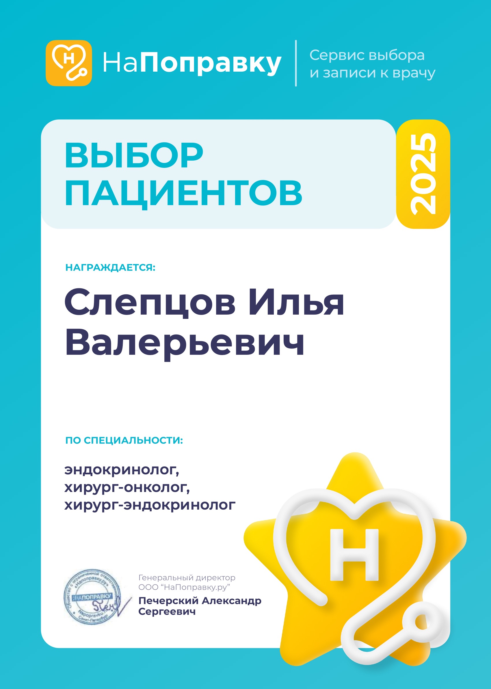 Илья Валерьевич оперировал мою дочь в июне 2025 года (диагноз - папиллярная карцинома щитовидной железы). Сложно подобрать слова, чтобы выразить чувства благодарности Илье Валерьевичу за его профессионализм, отзывчивость, человечность. Так случилось, что в нашей семье пришлось побывать за полгода дважды на операции в Северо-Западном центре эндокринологии и эндокринной хирургии Клиники высоких медицинских технологий им. Н. И. Пирогова Санкт-Петербургского государственного университета. Сначала диагноз был поставлен мне. Услышать слово «рак» страшно в любом возрасте. Мы из Белгородской области, но никакое расстояние не стало проблемой для того, чтобы попасть на консультацию к опытным докторам и понять, что делать дальше. С первых минут общения с доктором Слепцовым И.В. я поняла, что это профессионал в своей области, который с первых минут все грамотно, спокойно, доступно и последовательно объясняет, умеет подобрать такие слова, что ты понимаешь, что нельзя опускать руки и нужно продолжать бороться в любой ситуации.