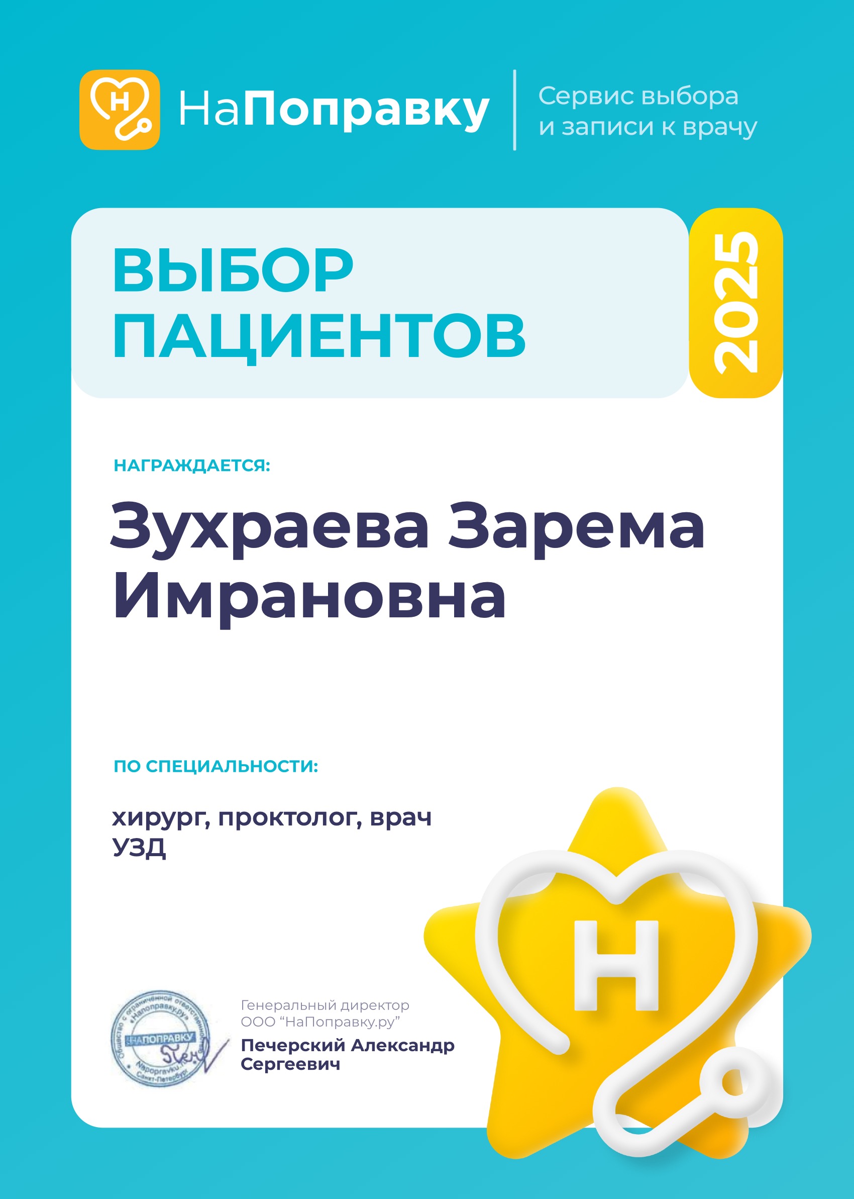 Сведения из сертификата специалиста, специальность и дата подтверждения: сертификат "Ультразвуковая диагностика", годен до 30.12.2025 г., выдан: АНО ДПО "Наро-Фоминский социально-деловой центр "Карьера".